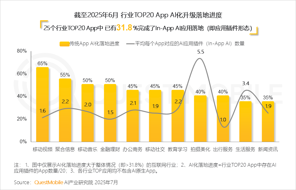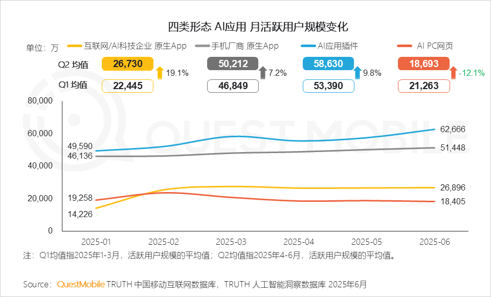 据商业智能数据服务商QuestMobile日前发布的《2025年中国移动互联网半年大报告》(下文简称报告)显示,“大模型”和“智能体”构成了2025年上半年AIGC发展的两条主线。围绕这两条竞争主线,过去半年,AIGC的总用户量持续向上突破,截止到2025年6月,互联网/AI科技企业原生App、插件形态AI应用爆发式增长,规模分别达2.7亿及6.3亿;手机厂商原生APP、AI PC网页端则呈现此消彼长的态势,规模分别达到5.1亿、1.8亿。
