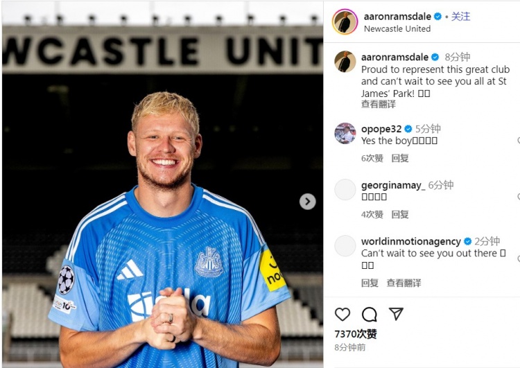 直播吧8月4日讯 此前官方消息,纽卡租借27岁南安普顿门将拉姆斯代尔,租期一个赛季,对于加盟纽卡,拉姆斯代尔在ins上晒图表达了自己的兴奋之情。
